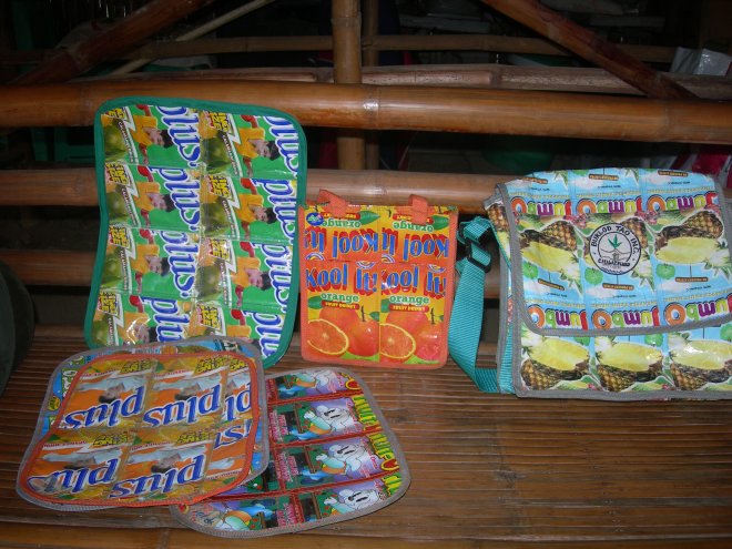 Les personnes qui ont des revenus très bas cherchent des moyens de générer des revenus supplémentaires ; par exemple, les compétences des femmes sont utilisées pour faire des sacs à base de sacs de jus de fruits recyclés.